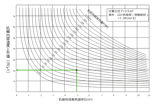 密封型机箱内置电子设备、装置时,可根据简单的公式及图表推算机箱内部温度上升值,该值与室外温度的和即为机箱内部温度。