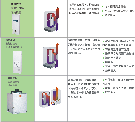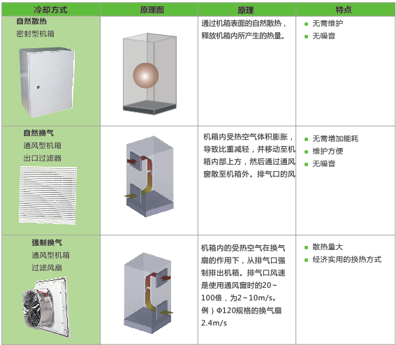 机箱的散热方法(冷却方式)由以下几种:通过机箱表面散热的自然散热、通过空气自然对流实现自然换气、利用风扇强制换气、使用热交换器进行密封散热以及使用冷却装置进行强制冷却等。详情如表1所示。