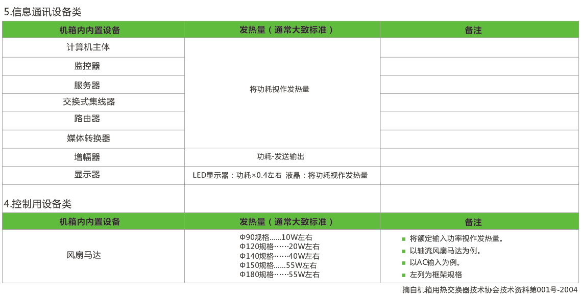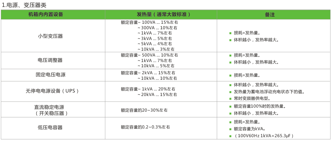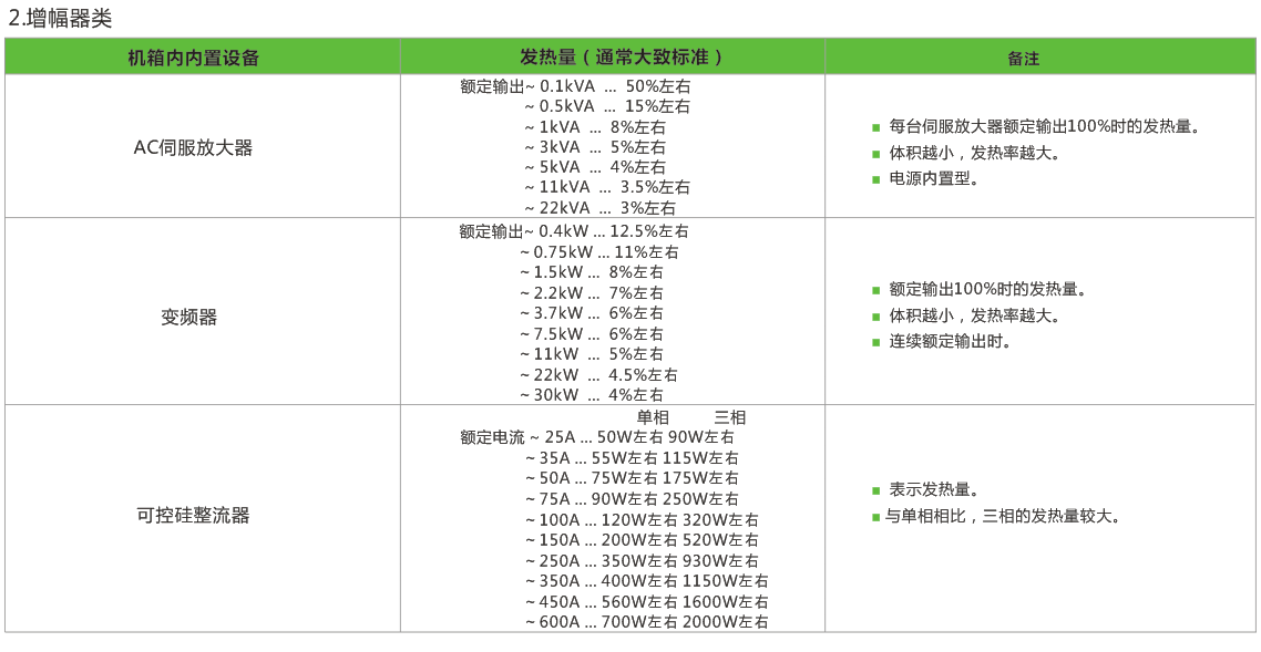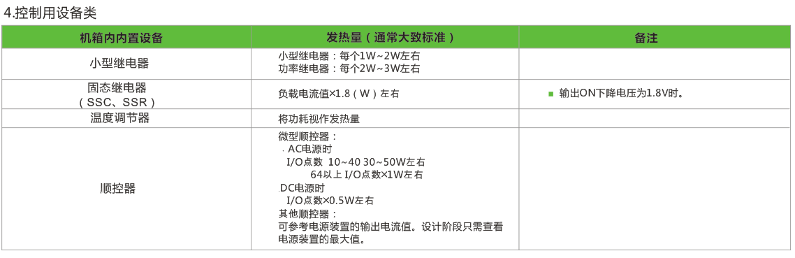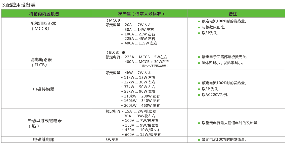 计算机箱内部实际总发热量时,除本资料所刊载的电气设备以外,内部配线及指示灯等不易计算的零部件的发热量虽小,但由于大量使用也应予以考虑。